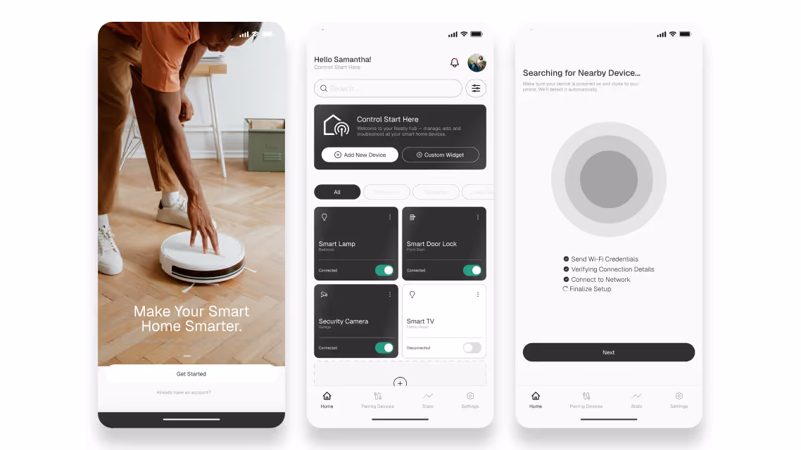 Nestly is a redesigned onboarding and pairing experience for a smart home platform that manages a variety of connected IoT devices such as lights, locks, sensors, and cameras. The platform had frequent user complaints around the setup process being confusing and inconsistent across device types.